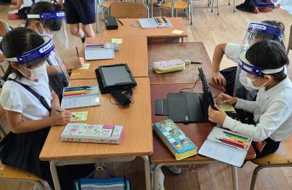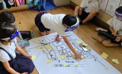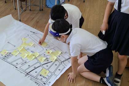 2年生は、生活科の学習で九条南マップ作りをしています。校区探検で見つけたことを、白地図に記録しています。校区探検の時にタブレットで撮影した写真を見ながら、絵を描き入れたり、場所を確認したりとグループで協力してマップを作っています。