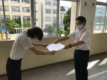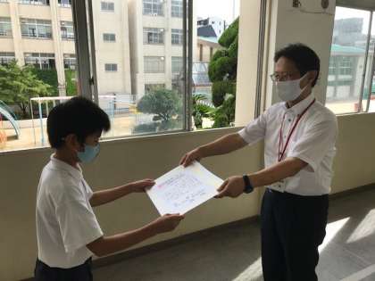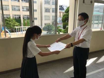 4年生(3年生で応募)が『最優秀賞』、6年生(5年生で応募)が『優秀賞』と『佳作』を見事受賞しました。校長先生より賞状と記念品が贈呈されました。放送での全校朝会でしたので、職員室での表彰式となりました。