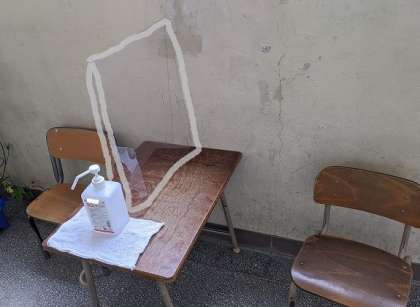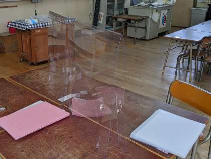 面談をする際は、間についたてをおいています。少し話しにくいですが、2m程度も離れるより話がしやすいと考えました。待っていただくところも、あいだについたてを置く、消毒用アルコールや消毒用シートを置くなどしています。