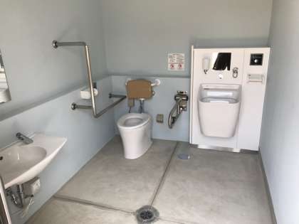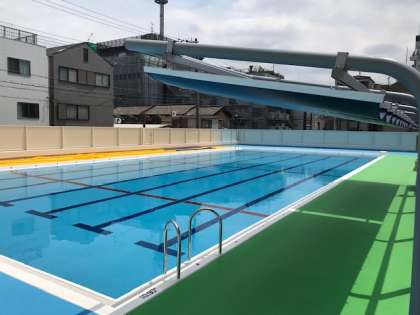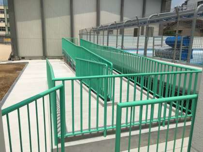 新しいプールには、スロープが設置され、児童に配慮したものとなっています。プールサイドは、三色に色分けされたり、トイレも広くなったりもしています。