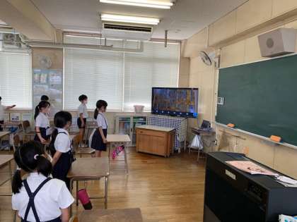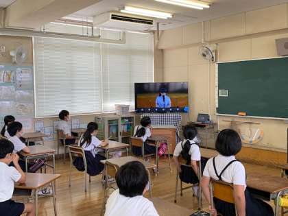 teams(双方向通信)を使って式を行いました。大型モニターに映る校長先生の話を静かに聞きました。校長先生の話は3つありました。一つは何でも言える学級づくりをこれからも続けていくこと。二つ目は、前日の8月6日に関連して平和について考えるきっかけにしてほしいこと。三つ目は、命を守ること(交通安全・不審者対応・熱中症予防に加えて新型コロナウィルス感染症予防)でした。生活指導担当者からも命を守ることについては詳しく話がありました。