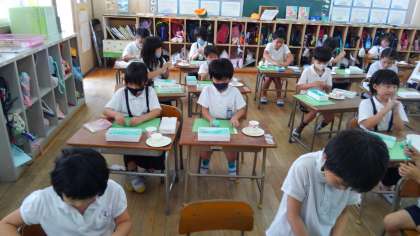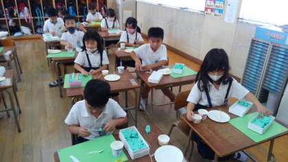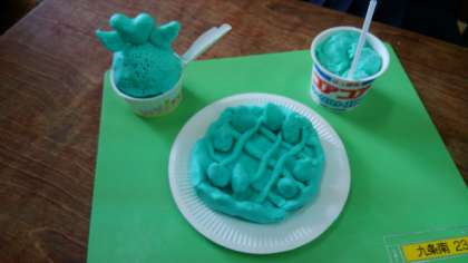 1年生の図工で、「ごちそうパーティーをひらこう!」の学習をしました。粘土を丸めたり、伸ばしたりして、いろいろなごちそうを作ります。ケーキやお寿司、アイスクリームなど、おいしそうなごちそうが並びました。