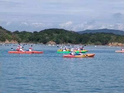 だいぶ沖まで出てきました。まだ思う方向へ進むのに苦労している艇もありますが、みんな、リーダーのかなさんの艇についていってます。
