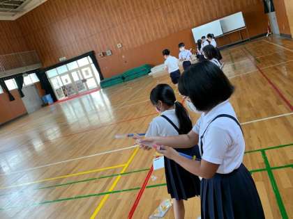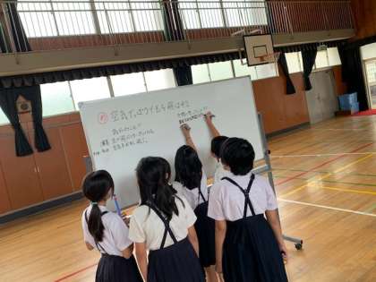 単元の始まりには、体育館で空気でっぽうを使って、玉を飛ばし、気づいたことを話しあいました。「飛ぶときにポン!と音がしたけど、何の音だろう」「玉を押し出したのは空気じゃないか」と、発見したことや疑問に感じたことを、ホワイトボードに書き出し、意見を出し合いました。