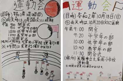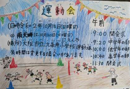 児童会で、話し合って決めた運動会の目標『協力して、安全に、笑顔あふれる運動会にしよう』が、校舎に掲示されました。秋晴れの青い空に輝いています。係の児童が作成したポスターも校内のそこここに掲示されています。いよいよ1週間後に運動会です。いつもと違った形になりますが、練習を積んだ子どもたちへの応援、よろしくお願いします。(今年は大きな声は出せませんが、温かい拍手でお願いします)