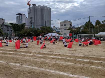 団体演技は、今年度は6年生のみの実施でした。9月に入ってから練習を始め、練習を重ねるごとに新しい技や隊形移動を吸収し、上達していく姿は、指導者にとってもとてもやりがいがありました。本番では、十二分に練習の成果を発揮し、堂々と大空へフラッグを掲げる姿に感動しました。