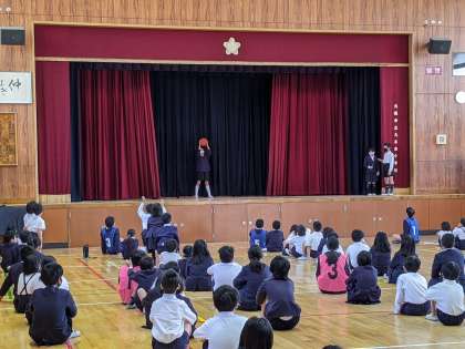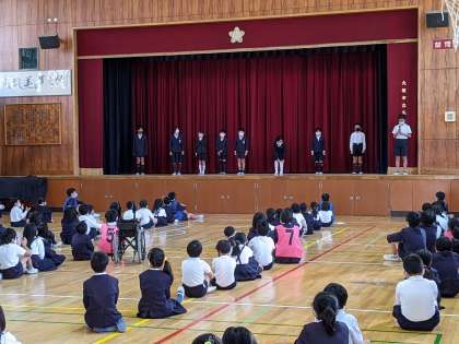 集会委員会が工夫しながら児童集会を企画運営してくれています。講堂に集まるのは、たてわり班の半数(今日は奇数班でした)で、クイズの答えもみんなでの相談はしないで、一人一人が考えます。