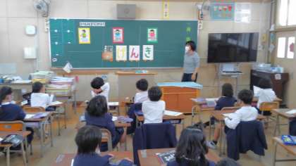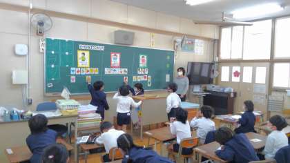 それぞれの働きについて知った後、配られたカードにかかれた食べ物がどの働きをするのかを考え、黒板に一人ずつ貼っていきます。結果は…全員大正解!しっかりと覚えていました。その日の給食は「カツカレーライス」でしたが、「じゃがいもは黄色」「にんじんは、赤いけど緑色」と、学習を思い出しながらおいしくいただきました。