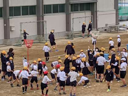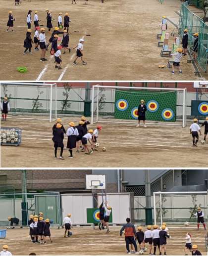 遊びを通して、楽しく運動ができる場を工夫してくれました。今回は、玉入れも登場しました。ドッジビーによる的あてコーナーに、サッカーのシュートコーナー、バスケットボールの1on1対決などなど、楽しいコーナーがたくさんありました。みんな、体を動かして楽しく運動していました。