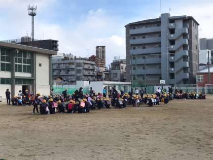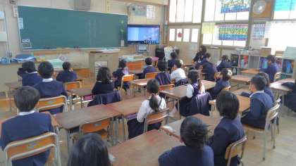 大阪市歌を聴いた後、校長先生のお話や生活指導の先生のお話を聞きました。子どもたちは、各教室で集中して話を聞いていました。最後に、校歌を聴いて始業式を終えました。