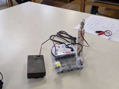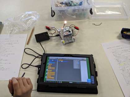 キットの組み立てから始めて、プログラミング用のソフトの使い方を確認し、プログラムをして動作確認をします。うまく電球がついて先生たちも「よし!」と「よし!」とうれしくなりました。