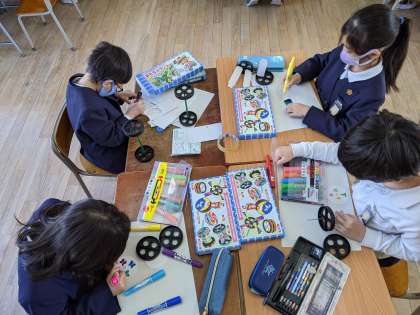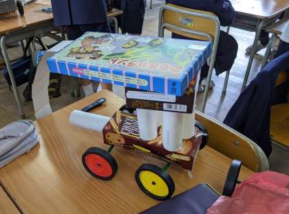 2年生は生活科の学習で、タイヤを使って動くおもちゃを作っています。タイヤを2つ使って、ヨーヨーやコマ、かざわを作る児童や、4つのタイヤを使って、箱を使った車などを作っています。家から持ってきた空き箱や牛乳パックなどで飾り付けをしたり、どうしたらうまく進むかを工夫したりしながらとても楽しそうに取り組んでいます。