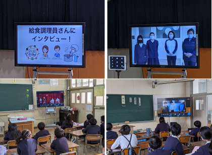 今年の人気アニメをもとにした劇、給食アンケート結果の発表や調理員さんへのインタビューなどをTeamsを活用して各教室で映し、視聴しました。