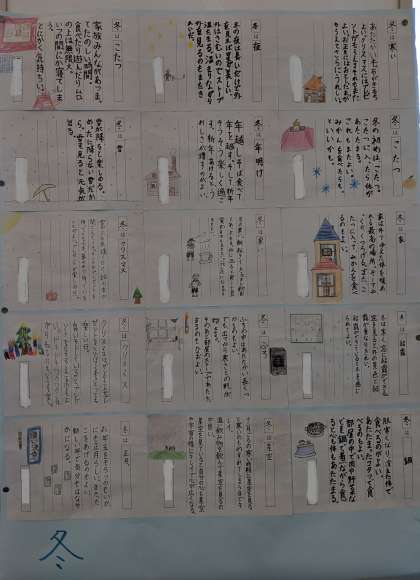 作品を味わった後に、一人一人が自分の好きな四季を選び、「春は・・・」「夏は・・・」「秋は・・・」「冬は・・・」と文章を書いてみました。季節がら、冬を選んだ子が多かったようです。一人一人の感性がキラリと光る作品ができ上りました。
