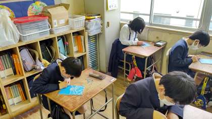 5年生では、4年生の時に学校休業でできなかった彫刻刀の学習をしています。宮沢賢治の絵本を読んで一番印象に残っている場面を題材に下絵を描き、版画用の板に写しました。その後、試し彫りをしました。初めて彫刻刀を使うので、とても慎重に取り組んでいました。彫り進めるにつれ、だんだん彫刻刀の使い方にも慣れ、きれいな線を彫ることができるようになってきました。今度の時間は、本番の板を彫り進めていきます。どんな作品ができるか楽しみです。