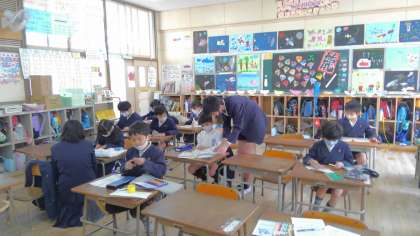 4日(木)の5時間目、たてわり班活動がありました。今回は、6年生へのメッセージカードを作成するため、1年生から5年生で行いました。初めて前に立つ5年生は、ちょっぴり緊張気味でしたが、「だいじょうぶ?」「上手にかけてるよ」と低学年にも優しく声をかけ、みんなが安心して取り組めるようにしていました。これまで6年生ががんばってきたことをしっかりと受け継いでいる姿が、頼もしく感じられました。