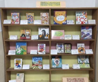 職員室前の廊下には、図書委員のおすすめの本がずらりと並んでいます。