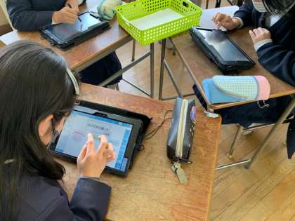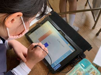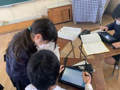 4年生の国語科「調べたことをほうこくしよう」の学習の様子です。グループで決めたテーマについて、学級でアンケートをとり、その結果をタブレットを使ってまとめ、プレゼン資料を作成しています。「グループワーク」という機能を使って、1つのプレゼンテーションをみんなで協力して作成していきます。まとめることができたら、報告会をしていきます。