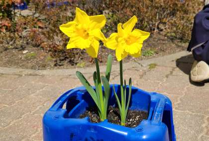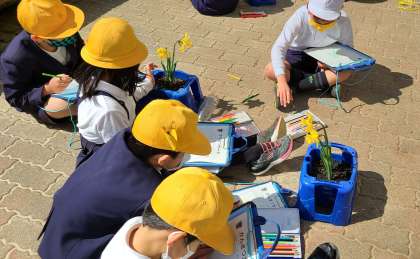 2年生で育てている「スイセン」がきれいに咲き始めました。きれいな黄色の花びらにラッパのような形。2年生の子どもたちは、よく観察しながら、カードにかきました。