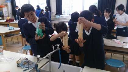 今年度最後のパソコン科学クラブでは、「今年度をふりかえって楽しかった実験をもう一度しよう!」と、前回のクラブで話し合って決めていた「スライムづくり」に取り組みました。今回のスライムはラメ入り絵具を使い、キラキラしたスライム。