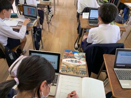 社会科で日本国憲法について学んでいて、三つの原則の一つである「基本的人権の尊重」について考え、1人1台端末を使って「子どもの権利条約」について調べました。