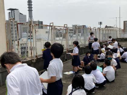 今日は、方位と方位じしんについて学んだあと、屋上に行き、学校の周りにはどんな建物や目印があるのか調べにいきました。