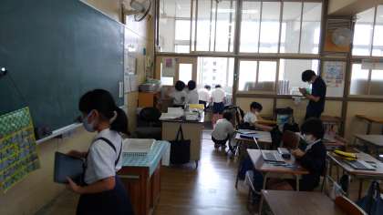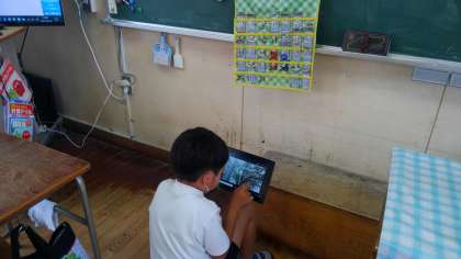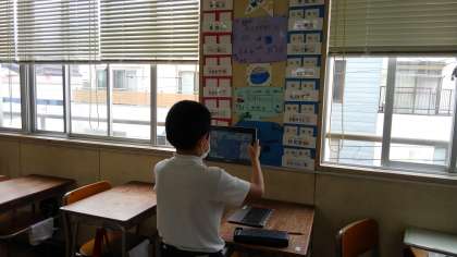 今日の6時間目の課題は、図工。モールで作った小さな人形を自分の好きな場所に置いてタブレットで撮影し、作品作りを楽しみました。学校に残っている子どもたちも、上靴の中に入れてみたり、筆箱に乗せてみたりと、工夫して撮影していました。家に帰った子たちの作品がTeamsのフォルダに届くと、「〇〇さんのが、もう届いてる!」「△△さんのも来た!」と、とても嬉しそう。離れていても、つながっているんだなと感じられたひとときでした。
