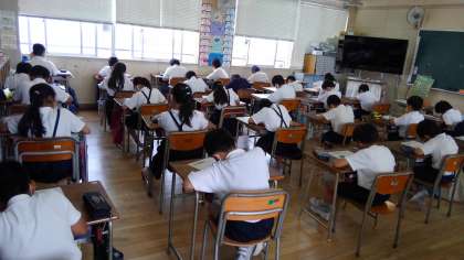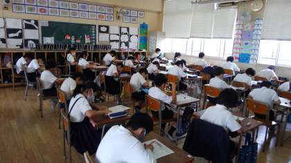 今日は、算数・国語・社会と3教科でテストをしました。集中してテストに向かえるように隣との距離を確保するために普段の授業とは違う方向に机を向け、「用意スタート!」の掛け声で一斉に問題を解き始めます。しんと静まり返った教室に鉛筆の音だけが響き、みんな真剣な表情で問題に取り組んでいました。