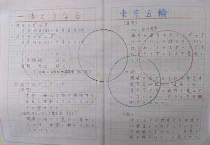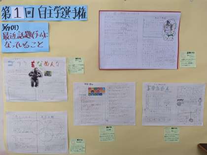 6年生では、あるテーマに沿って自分で調べてきたことをノート見開き1ページにまとめる「自主学選手権」を行っています。変則登校となった5月には「いま話題(ブーム)となっていること」についてまとめました。