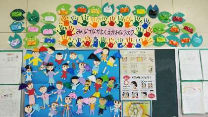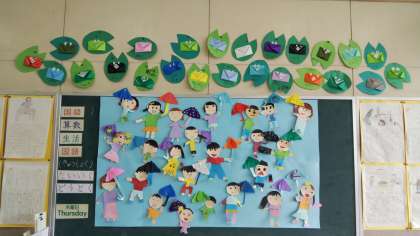 雨の日が続きます。、2年生の教室の後ろには、子どもたちの作った色とりどりのカエルや傘を持った子どもたちの掲示物が並んでいます。