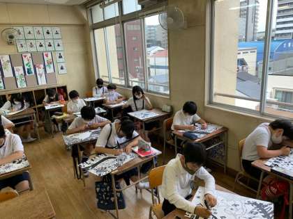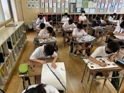 6年生の図工科では「花降る街」の学習をしています。下書きは一切せず、サインペンの黒と画用紙の白のみで花が降る街なみを描いていきます。細かい部分までこだわり、集中力を高く維持しながら作品をしあげていっています。