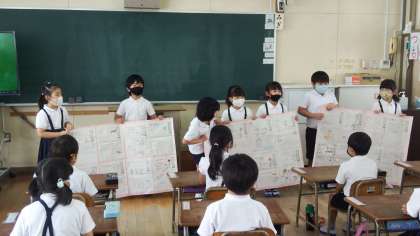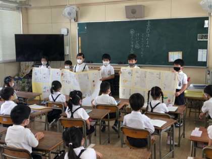 2年生は、先日作成した「1年生に教えてあげるよ新聞」を1年生の教室へ出向き、届けてきました。静かに座って、2年生のお話を聞いている1年生の前で、代表の児童が緊張をしながら挨拶をしました。