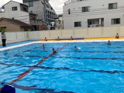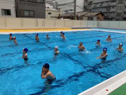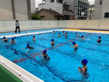 プールでは、音楽に合わせて踊りながら水慣れをしたり、友だちと水中じゃんけんをしたりして、久しぶりのプールに慣れていきました。
