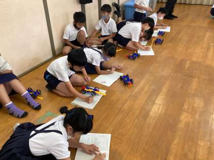 今週の理科では、ゴムの力について学んでいます。まずは、ゴムを使って動く車を自由に動かして遊んでみました。そこで、気づいたことや調べたいことをまとめました。