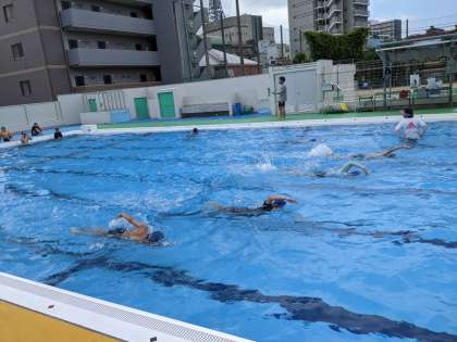 6年生のプール開きの様子です。ややくもり空の中でのプール開きとなりました。約1年ぶりの水泳学習にも関わらず、素早くプールサイドに並び、自分の泳ぎを確かめながら25mを泳いでいました。