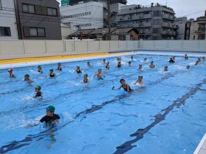 プールサイドを持ちながら、顔つけ、頭までもぐる、ふしうき、バタ足に挑戦しました。次にプールの真ん中で、水を押したり、水面をたたいてみたり、水慣れを楽しみました。水の中に入るだけでも、たくさん力を使って、次の時間は、とても疲れていた2年生でした。