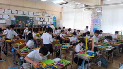 4年生では、図工で「コロコロガーレ」を作っています。一番上の階からビー玉を転がして、一番下の階のゴールまでたどり着けるようにする、立体迷路です。行き止まりを作ったり、上から迷路が見えないように屋根を取り付けたりと、みんなそれぞれくふうをしながら夢中で取り組んでいます。来週中に持って帰りますので、楽しみにしていてください。