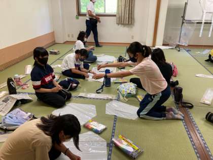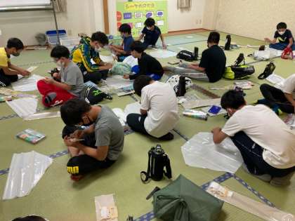 風呂の掟、9か条を守って今日一日の汗を洗い流しました。入浴を待っている間は、お風呂場の隣の大広間で凧作りです。思い思いの絵を描いて仕上げていきます。