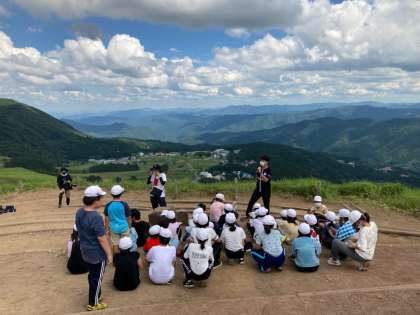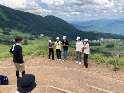 順調に登山をしています。山頂に行く前に、ちょっと休憩!グループで記念撮影もしています。