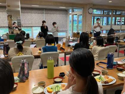 前を向いて黙食にはなりますが、楽しい雰囲気で食事をしています。