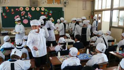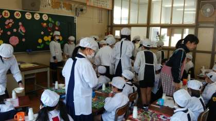 1年生の給食の時間、6年生が給食室から運んで来たり、配膳したりと、お手伝いをしています。「ふむふむ、こうすればいいんだな。」と、1年生は6年生のお兄さん・お姉さんのてきぱきとしたようすをじっと見つめていました。