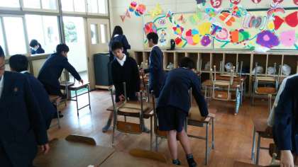1年生が下校した後、1年生の教室の清掃をする6年生の姿も見られました。