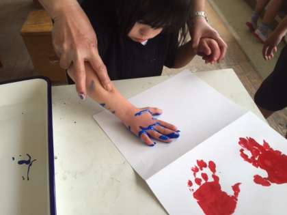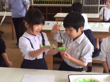 二人でペアになり、互いの手に絵の具を塗りました。