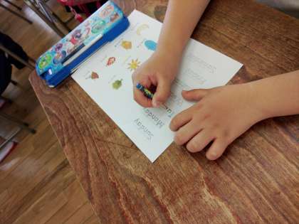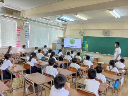 4年生では、曜日の言い方を学習しています。スライドを見ながら、発音を練習した後、会話文の動画を観たり、ワークシートに単語を書いたりして、学習を進めました。
