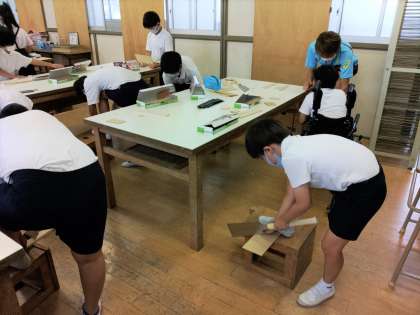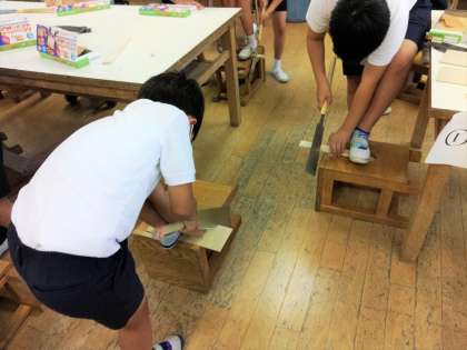 3年生のときは「くぎ打ち名人」でしたが、4年生では「ギコギコトントンクリエーター」に挑戦です。初めてのノコギリに、初めは恐る恐る木を切り始めた子どもたち。何度も切っているうちに、だんだんノコギリを持つ姿勢も様になってきました。授業が終わった後、木の切りくずをほうきで集めてくれている子たちの姿が……。みんなのために、自分ができることを進んでできるのが、素敵ですね。来週も、この続きを作ります。どんな作品が出来上がるか、楽しみにしいてください。