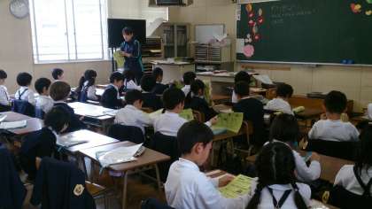 1年生の教室の前を通ると、担任の先生がお手紙(家庭への配付物)を配っていました。