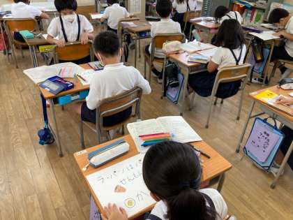 3年生の総合的な学習の時間です。社会科で学んだこと・調べてきたことをクイズにして、友だちに出題しようと、画用紙にていねいに書いています。