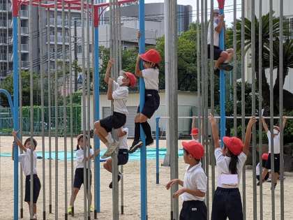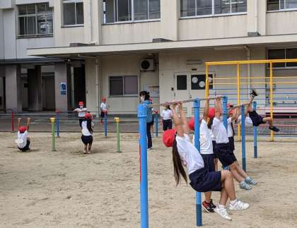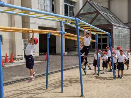 そのあとは、鉄棒やのぼり棒、うんていを使って運動をしました。鉄棒では、「つばめ」や「ぶらさがり」にチャレンジしたり、のぼり棒の上まで登ったり、長い時間つかまる練習をしたりしました。