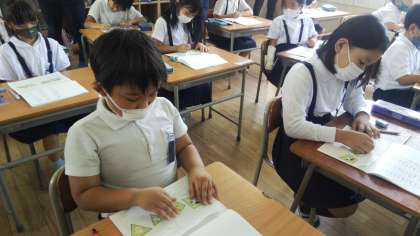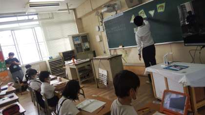 2年生では、三角形と四角形「形をしらべよう」を学習しています。2つの形の仲間分けを通して、三角形とは、四角形とは、を「かど(頂点)や直線(辺)の数に着目して、学習しました。みんな一生懸命に考えました。