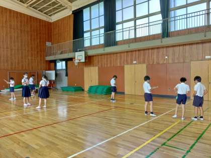 理科の学習では、空気でっぽうの実験道具を使って、とじこめた空気を押してスポンジの玉を飛ばす活動を行いました。道具を持って講堂へ行くと、どうすれば玉を飛ばせるか、早速いろいろと試し始めました。しばらくすると、「ポン!」といい音が。「どうやったん?」「ここをこうやって…」と、あちらこちらで教え合う姿が見られ、次々にポン!ポン!と、いい音が響きだしました。